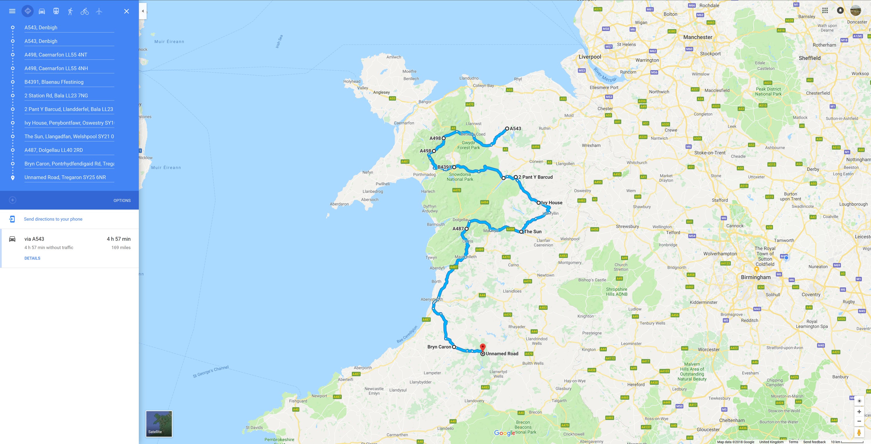 The afternoon consisted of a push down the west coast, before cutting inland past Tregaron towards our stop for the night. Tight single track intersected by some more open B-Road stretches made for good driving, with traffic definitely present but not as bad as expected. The jewel in the crown of the afternoon was undoubtedly a section of pristine back road just south of Pontrhydfendigaid, which shared more similarities with a roller coaster than a road. Near vertical crests with sweeping troughs, switchbacks so tight you thought you'd have to take a second swing at them, and sheer drops on the side that made you reconsider your throttle position like nothing else on the trip.